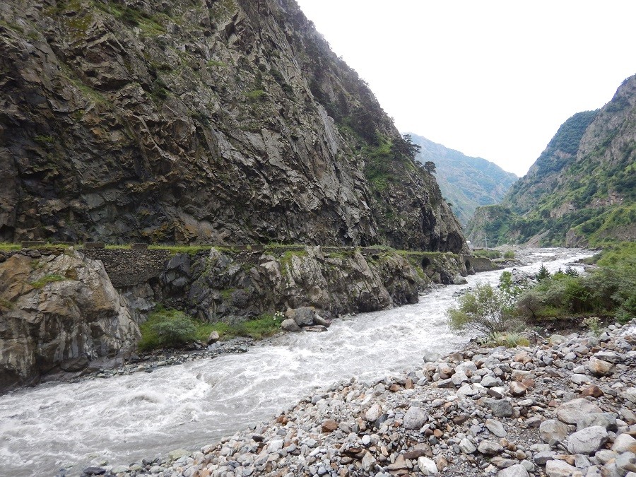 Rzeka Terek, Wąwóz Darialski w jego najwęższej części, po lewej skalne brzegi pasma Okhuri, u podstawy którego przebiega Gruzińska Droga Wojenna, domena publiczna