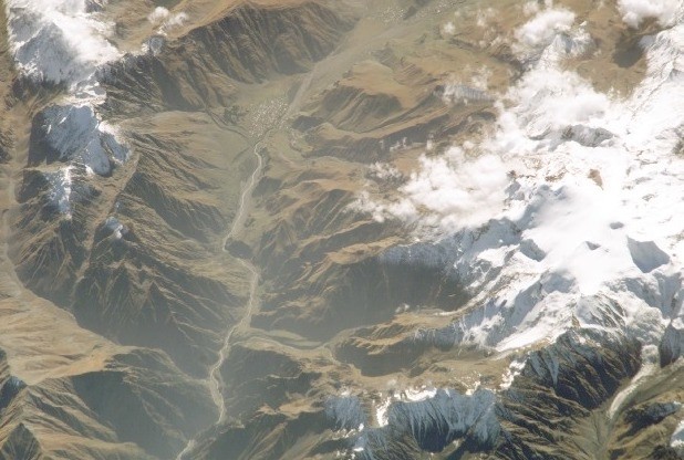 Zdjęcie satelitarne, widoczne osiedle w dolinie to Stepancminda, domena publiczna