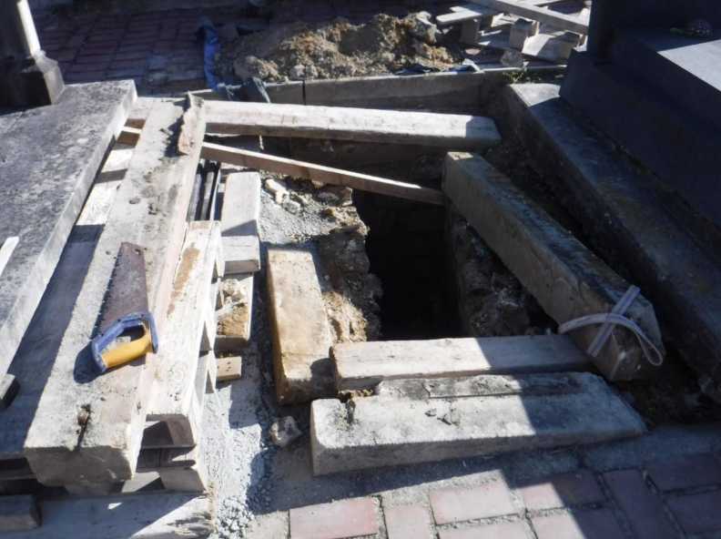 Wtórne płyty marmurowe pokrywających wapienne płyty oraz kamienie podstawy zostały zdemontowane, a naokoło tumb grobowych usuwane są wtórne nawarstwienia na nagrobku. Wykonano fundament pod obramowanie nagrobka tak, aby podwyższyć go o ok. 15 cm. Zdemontowane zostało również metalowe ogrodzenie, które w celu zabezpieczenia zostało przewiezione do pracowni. Płyty nakrywające są w bardzo złym stanie zachowania a montaż okładziny został wykonany z użyciem nieodpowiednich materiałów, w czasie kiedy płyty nakrywające były mokre. Docelowo zdemontowane płyty nagrobka po wykonaniu prac technicznych, a następnie konserwatorskich zostaną przywrócone.